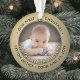 Celebre o presente de precioso do seu mais novo membro da família com uma foto personalizada de 2 "Nosso Primeiro Natal como Avós", um ornamento cerâmico em folha de ouro falso. A design neutra em termos de gênero é adequada para um novo bebê ou netinho. Imagem e todo texto neste modelo são simples de personalizar. (DICAS DE IMAGEM e DESIGN DE TEXTO: 1) Para ajustar a posição do texto, adicione espaços no início ou no fim. 2) Uma maneira fácil de centralizar uma foto exatamente como você deseja é recortá-la em forma quadrada antes de ser carregada no site do Zazzle.) Design apresenta uma borda falsa dourada, tipografia do estilo na moda vintage art deco, nome e data de nascimento do bebê e duas fotos da sua escolha. Esta marca única acrescenta um toque elegante às decorações de casa dos novos avós no Natal. Observe que o ouro é impresso a cor, não a folha metálica. Feliz Natal Vovó e Vovô!