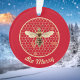 Este design de ornamento festivo mostra uma abelha real em um círculo de alveolado, com as letras Abelha Feliz embaixo dela. Esta design é uma homenagem à nossa tão importante cultura de abelhas, ao mesmo tempo que enviamos desejos felizes. Esta design é dourada e preta sobre fundo vermelho.