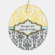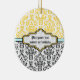 ornamento personalizado do aqua preto-branco-cor damasco preto. A parte superior é de cor damasco amarela e branca e a parte inferior é de preto e branco. A faixa de Aa aqua separa as duas partes. Seu texto é digitado em um rótulo elegante com contorno branco e amarelo. Um excelente para casamentos especiais, aniversários.