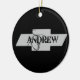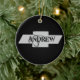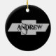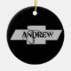 Um ornamento preto redondo com Andrew num emblema de Chevy.