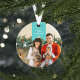 Personalize este elegante ornamento redondo com uma foto em cada lado para comemorar um ano especial. Personalize a frente com seu nome de família em branco em uma faixa vibrante de friso de cor turquesa e adicione o ano às costas.