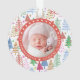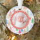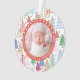 Este adorável ornamento de Natal personalizado para novos avós apresenta uma foto circular de bebê na frente com um quadro vermelho e uma borda de árvores de Natal brancas desenhadas à mão em verde, azul, vermelho e rosa sobre um fundo branco. O ornamento diz "Nosso Primeiro Natal Como Avós 20XX" acentuado por corações. A parte de trás do ornamento tem uma foto de bebê segundo com o nome de um bebê para você se personalizar também. Desenhada pela artista Susan Coffey.