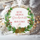 Esta design apresenta uma impermeável corante aquoso, coroa de natal, decorada com cones de pínus, bagas e canas doces, rodeando as palavras "Nosso Primeiro Natal como Avós" em tipografias brancas e vermelhas e fontas. Personalize acrescentando o nome do bebê e o ano. Personalize o verso com uma foto favorita do novo neto, cercada pela mesma coroa.