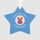 O anjo cabeludo louro veste a bandeira da Noruega em um ornamento em forma de estrela para feriado e decoração de Chanucá. Design criado para famílias com múltiplas religiões. A bandeira norueguesa Anjo Chanucá é dentro do círculo de quadrados brancos quadrados brancos. O fundo é quadrado azul. Adicione seu próprio texto ou personalize com o ano e personalize com um nome.