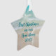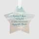 Primeiro ornamento de peixe-estrela de Natal. Manutenção em acrílico em forma de estrela com texto em ambos os lados. Inclua o texto do evento com a data de um lado e os nomes e endereços do outro. A água do mar e a areia da praia são o fundo do texto verde-marinho. Dois estrelas-do-mar também decoram cada lado. Alterar a redação e a utilização para qualquer ocasião com nomes e datas. O design funciona também para as outras formas de ornamento, mas a colocação de design pode mudar.