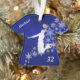 Este ornamento de Férias apresenta um jogador de basquete prateado de silhueta que dunking a bola em frente a um spray de flocos de neve ornamentado prata. A imagem é colocada sobre um fundo azul profundo gradiente. Seu texto personalizado está em prata na manga esquerda, e no canto inferior direito. A parte de trás do ornamento tem o mesmo fundo azul e flocos de neve, e campos de texto adicionais para você personalizar. Perfeito para o jogador de basquete ou fã.