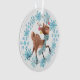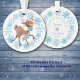 Neste Enfeites de natal, um veado adorável veste um lenço azul de inverno, com lâmpadas amarelas e cor-de-rosa penduradas em suas galhadas. Ele também veste skates! A imagem é fechada com uma coroa azul de gelo floco de neve. A parte traseira do ornamento tem a mesma imagem de wreath, com campos de texto para sua personalização. Um floco de neve prateado serve no meio como um divisor. Bonita!