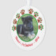 Celebre o Natal de 1rua do seu animal de estimação com o adorável ornamento de árvores de Natal design, vermelho e verde, impresso para pata. Na frente adicione uma bela foto do seu filhote, gatinho, coelho Guiné Pig ou qualquer outro animal de estimação. ( Para obter resultados mais rápidos/melhores, escolha uma foto com o assunto no meio e/ou faça um pré-recorte da sua imagem em forma quadrada ANTES de carregar) Personalize com seu nome, evento e ano. O verso contém um padrão de impressão de pata em vermelho e verde. Perfeito como presente para amantes de os animais, especialmente donos de cães e gatos.