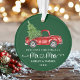 A Caligrafia Moderna Mancha Coração Nosso Primeiro Natal como Sr. e Sra. - Watercolor Vintage Red Truck Ornament - Fundo Verde Florestal
