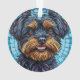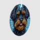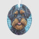 Arte digital colorida de um terrier com olhos castanhos escuros expressivos e pelo vibrante, cercado por um fundo decorativo em estilo mosaico. Representa lealdade, charme e uma expressão artística de design canino.