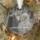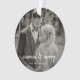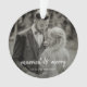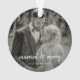 Belo enfeites de natal de fotografia do dia do casamento com uma citação simples, moderna e minimalista "casada e feliz" na tipografia escrita à mão. Este design versátil pode ser personalizado com sua própria fotografia, nome e data para fazer uma design em homenagem ao seu dia especial. A carta mostra um exemplo de imagem de um casal no dia do casamento. A ponte está vestindo um intrincado vestido de noiva de vassoura com rendas e pérolas e tem cabelos louro e compridos. O noivo tem uma barba aparada está vestindo um terno escuro de três pedras, gravata de arco e buraco no botão floral. Eles estão juntos amavelmente com as mãos à volta das esperas dela, num campo com árvores ao fundo. A vibração é romântica e selvagem. A imagem é maravilhosamente tirada em monocótomos de sépia preto e branco. Esta imagem foi concebida como um marcador de posição para ser substituída pela sua fotografia ou imagem de família favorita.