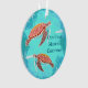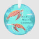 Primeiro Natal de casados ornamento acrílico com um tema de vida marinha tropical. Duas tartarugas marinhas na frente com o texto "Nosso primeiro Natal de casados" - ou altere. O verso tem o mesmo design azul debaixo do mar com um espaço para nomes, endereço residencial e data.