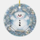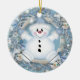 Este adorável ornamento cerâmico de Natal, apresenta uma coroa azul e branca prateada e um bonitinho bonitão vestindo luvas azuis e um chapéu azul de Natal.