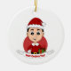 Enfeites de natal com uma ilustração de um sorridente menino feliz de cabelos negros, ele está vestindo fantasia vermelha e branca do Papai Noel e segurando um presente; com texto editável modelo para seu nome ou mensagem, design de Natal
