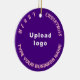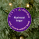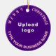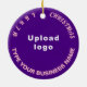 Feliz Natal! O ornamento cerâmico com textos de saudação de Feliz Natal, nome e logotipo da sua empresa ou empresa. Designs são textos cor-de-rosa sobre fundo roxo e em forma circular. Ornamento para decorar a árvore de Natal em sua loja, compro ou escritório. Ornamento para receber visualmente seus clientes nesta temporada de feriados e anunciar sua empresa ou promover seu nome de marca. Personalize-o e use-o para criar reconhecimento de nome de marca. Verifique a aparência após carregar o logotipo e digitar o nome da sua empresa. Se a aparência lhe agrada, você pode colocar seu pedido agora. Se você precisar redimensionar e mover o logotipo e os textos para o ajustado neste ornamento ou em outros estilos que você escolher, mude na ferramenta design. Você também pode fazer outras alterações de acordo com sua preferência na ferramenta design, como alterar a cor do ornamento, a cor da fonte e o estilo da fonte. Feliz Natal! Desejo mais vendas para você neste feriado.