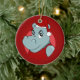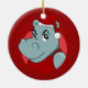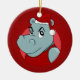Enfeites de natal com uma ilustração de um hipopótamo feliz bonito com um chapéu de Papai Noel vermelho e branco; design de Natal para crianças, em um fundo vermelho