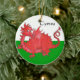 Um ornamento cerâmico redondo frente e verso a personalizar, com um dragão vermelho bonito em um fundo verde e branco, similar à bandeira nacional de Galês; de uma ilustração lunática pintado à mão por Judy Adamson.