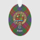 Crachá da crista de clã Fraser cercado por uma correia e fivela sobre fundo de tartã. Texto personalizado de ambos os lados.