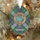 Crachá da crista Clan MacKenzie rodeado por uma correia e fivela sobre o fundo de tartan vestido. Texto personalizado de ambos os lados.