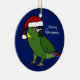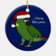 Feliz Natal! Ornamento colocado um colar amarelo do Macaw dos desenhos animados do papagaio que veste um boné do papai noel, contra um fundo azul escuro. Decorações fabulosas do amante do pássaro esta época natalícia.