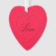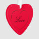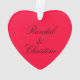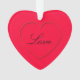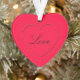 O lado frontal do ornamento em forma de coração mostra um coração vermelho com um coração vermelho com estrutura de arame no centro. No centro do coração menor está a palavra "Amor" na escrita. Do lado oposto, personalize com nomes em script preto.