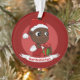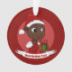 Enfeites de natal com uma ilustração de uma menina ou rapaz preto feliz sorridente e feliz, o bebê está vestindo roupas vermelhas e brancas e segurando um presente; com texto editável modelo para seu nome ou mensagem, design de Natal com fundo vermelho