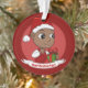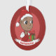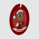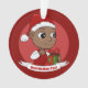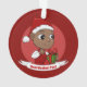 Enfeites de natal com uma ilustração de uma menina ou rapaz preto feliz sorridente e feliz, o bebê está vestindo roupas vermelhas e brancas e segurando um presente; com texto editável modelo para seu nome ou mensagem, design de Natal com fundo vermelho