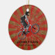Ornamento Personalizado do Extreme Biker Natal 20XX. Um motociclista fazendo uma caminhada contra um fundo vermelho e dourado de explosão de estrelas. Todo texto personalizável, frente e verso!