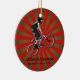 Ornamento Personalizado do Extreme Biker Natal 20XX. Um motociclista fazendo uma caminhada contra um fundo vermelho e dourado de explosão de estrelas. Todo texto personalizável, frente e verso!