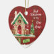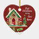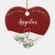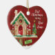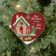 Para o Primeiro Natal em uma Nova Casa, este adorável ornamento cerâmico em forma de coração faria um belo presente de guardião para si mesmo ou para um amigo. Um solteiro minúsculo robin está se espiando pela janela de uma casa de pássaros festivamente decorada que se senta sobre um rico fundo vermelho-tartano. A parte de trás do ornamento apresenta neve branca sobre o padrão de tartã vermelho, e a legenda 'Casa é onde está o CORAÇÃO'. Ambos os lados deste adorável ornamento podem ser personalizados.