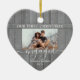 Celebre o alegre feriado de 1rua do seu noivado com uma foto personalizada em forma de coração 2 "Our First Christmas Engaged", um ornamento de cerâmica de madeira falsa. Todo texto e imagens neste modelo são simples de personalizar. (DICA DE IMAGEM: Uma maneira fácil de centralizar uma foto exatamente como você deseja é recortá-la antes de carregá-la no site do Zazzle.) Como ideia, a tipografia pode ler "Juntos" ou "Casados". O design moderno estilo fazenda apresenta uma na moda, uma fronteira de madeira rustic faux, caligrafia manual, os nomes e anos dos casais e duas fotos da sua escolha. Esta única vitória de casamento adiciona um toque elegante às decorações das casas de Natal.