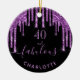 Uma moda e glamourosa enfeite de aniversário de 40 anos. Um fundo preto clássico, decorado com púrpura escura, púrpura, pingos de brilho, pintura pingando. Com o texto: 40 e fabuloso. Personalize e adicione um nome. Texto cor púrpura. A palavra Fabuloso é escrita com um moderno estilo escrito à mão com traços. Perfeito como presente, favor de festa ou como decoração de mesa de festa.