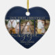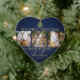Celebre o alegre feriado de 1rua do seu noivado com uma colagem personalizada de 4 fotos "Nosso Primeiro Natal Engajado", marinho azul e ornamento cerâmico em forma de coração dourado. Todo texto e imagens neste modelo são simples de personalizar. (DICA DE IMAGEM: Uma maneira fácil de centralizar uma foto exatamente como você deseja é recortá-la antes de carregá-la no site do Zazzle.) Como ideia, a tipografia pode ler "Juntos" ou "Casados". Design apresenta uma na moda marinho Blue ombre border, handwrite style calliographic, os nomes e o ano do casal e quatro fotos da sua escolha. Esta única vitória de casamento adiciona um toque elegante às decorações das casas de Natal. Note que o ouro é impresso a cor, não a folha metálica