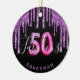 Uma moda e glamourosa ornamento de 50 anos. Um fundo preto clássico, decorado com púrpura escura, púrpura, pingos de brilho, pintura pingando. Com o texto: 50 Fabuloso. Personalize e adicione um nome. Texto cor púrpura. A palavra Fabuloso é escrita com um moderno estilo escrito à mão. O número 50 é escrito com uma fonte moderna no estilo do balão. Perfeito como presente, favor de festa ou como decoração de mesa de festa.