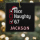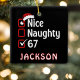Bring a bit of social media-inspired humor to your holiday décor with this double-sided “Nice, Naughty, 67” ornament. Featuring the same cheeky design on both sides — bold red checkboxes, a Santa hat, and that mysteriously funny “67” — it’s a conversation starter for any tree. The crisp white lettering pops against the classic black background for a sleek, modern look that fits both minimalist and playful Christmas styles. Makes a hilarious stocking stuffer or small gift for friends, coworkers, or anyone who loves random internet jokes. Personalize with any name for an extra touch of fun.