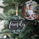 Celebre o que mais importa com este adorável ornamento personalizado com as palavras "Paz, Amor, Alegria, Família" junto com seu nome familiar e o ano, enfeitiçado com a cor d'água verde folhas e folhagem de inverno. Personalize as costas com uma foto favorita.
