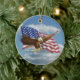 Um ornamento cerâmico redondo com a imagem de uma bandeira americana que se acenava e uma águia careca em voo contra um céu azul nublado na frente. O verso tem uma imagem de um céu azul nublado e texto opcional. Veja o ornamento correspondente da escultura de fotos acrílicas. Veja toda a coleção de ornamentos Patriótica dos anos 40 em TOUCHES ESPECIAIS | Seção Favoritos para festas.