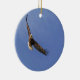 Uma águia-careca adulta numa curva afiada, realçada por um céu azul.