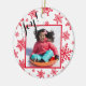 Esta Enfeites de natal festiva mostra sua foto cercada por uma recompensa de flocos de neve vermelhos em um fundo branco com a legenda: Alegria! Bela lembrança de presente ou de guarda. As costas têm espaço para a sua própria mensagem.