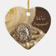 Celebre seu primeiro Natal como um casal recém-noivo e comemore o dia especial que ele lhe propôs com o elegante Anel do Noivado Oval Diamond e Ornamento Rosa Branca. Personalize-o com os nomes pessoais da noiva e do noivo e a data em que ele fez a pergunta. Este costume clássico Somos o ornamento Engaged apresenta uma fotografia floral próxima de um anel de noivado de diamante cortado oval, colar de pérolas brancas e flor de rosa branca com um fundo de seda marrom.