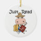 Leia T-shirts, capuzes, canecas, cartões, autocolantes, botões, ímãs, mousépias, jornais, guardas e outras roupa de leitura e presentes que promovem a leitura de uma forma fofa! Uma vaca com chapéu de palha e garfo de jarra descansa contra um fardo de feno com um livro!
