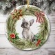 Este ornamento de Feriado bonito apresenta um adorável Bulldog Francês. O cachorro é enquadrado com uma pínus pinheirada, cortada por uma estrela vermelha, verde e dourada que o cachorro está olhando. Também está incluído um arco e poinsettia listrados e sagrado com bagas vermelhas. A parte de trás do ornamento tem a mesma coroa, com dois campos de texto para personalizar.