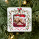 No Enfeites de natal de tendências que mostra suas fotos mostradas em uma borda vermelha de moldura branca ondulada adornada com ilustrações aquarelas de um arco vermelho coquetel e verde-azulado sazonal, e seu nome e o ano na tipografia clássica da serifa vermelha.