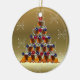 Lâmpadas de cerveja são empilhadas em uma pirâmide, decoradas com bolas, luzes e uma bela estrela vermelha em cima. A base é feita de batatas fritas e amendoins na casca. Está na hora da festa.