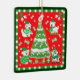Ilustração vintage em vermelho e verde com design de Natal, apresentando bebês peludos fofos, cachorrinhos e cães usando suéteres e chapéus de Papai Noel. Uma árvore de Natal decorada tem presentes embaixo. Ossos de cachorro, estrelas e sinos dourados decoram esta imagem.