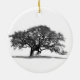 Uma fotografia a preto e branco de um belo carvalho que se espalha.