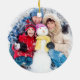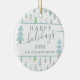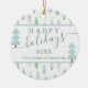 Crie um ornamento de fotos de férias com abstrato de árvores de Natal modernas e árvores de floresta e padrões de neve de inverno em tons de azul, verde e branco com a saudação FELIZES HOLIDAYS em roteiro manuscrito e personalizado com seu nome e ano na frente uma foto de sangria de cheio no verso. Entre em contato com o designer por meio do Zazzle Chat ou makeitaboutyoustore@gmail.com se você quiser que este design seja modificado, em outro produto ou quiser coordenar itens.
