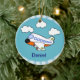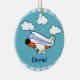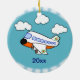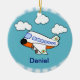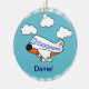 Avião de animação adorável voando pelos céus e nuvens azuis. Sobre um fundo de explosão solar em azul