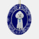 Na frente deste Enfeites de natal está uma bela imagem de aquarela de um adorável Cachorro de Poodle Miniatura Branco. O poodle veste um colar azul com uma etiqueta de floco de neve pendurada nele. A imagem é colocada em um círculo azul real formado por um padrão branco de floco de neve em um fundo azul correspondente. A parte de trás do ornamento tem o mesmo fundo e círculo com o seu texto personalizado em branco. Perfeito para quem perdeu o coração para um poodle!