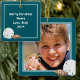 Manutenção do Enfeites de natal fotográfico com conchas e texto. Cerâmica, ornamento quadrado tem foto de um lado e texto do outro. A cor azul-esverdeada do mar enquadra a foto com um dólar de areia e uma concha de junônia no canto. No verso, use o modelo de texto para adicionar seu nome, idade, ano e qualquer outro texto. Use como guardiã para um filho ou filha, ou como costume dar aos avós no Natal.